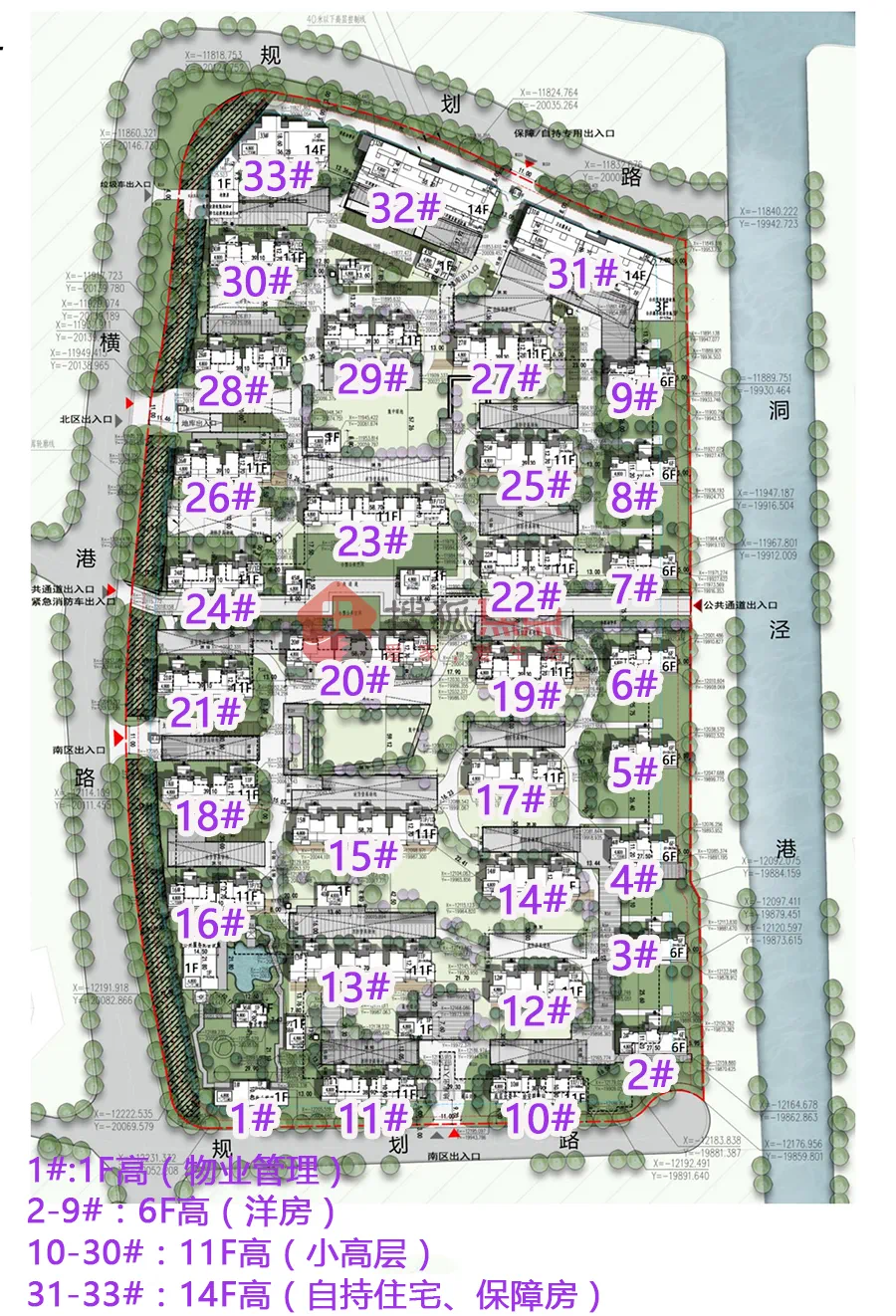 据方案显示,地块1#为物业管理房、2-9#为沿洞泾港分布的8幢洋房,10-30#均为11层高的小高层房源,31-33#为14层高的自持住宅和保障房。