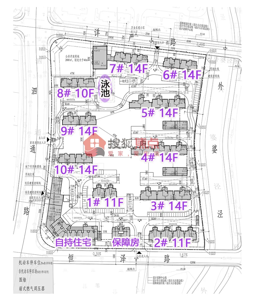 据方案显示,小区共有12幢,1-10#为10-14层高的小高层商品住宅,另外2幢为17层高保障房和17层高自持住宅。小区主入口位于泗通路。