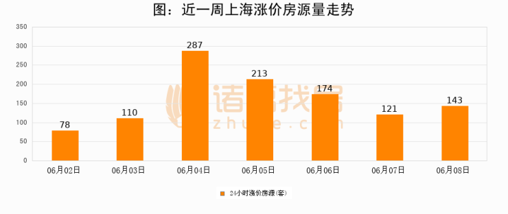 根据诸葛找房数据显示,上海24小时涨价房源量为143套,较06月07日增加22套,环比上涨18.2%。与此同时,涨价房源占比小幅扩大,业主信心有所提升。