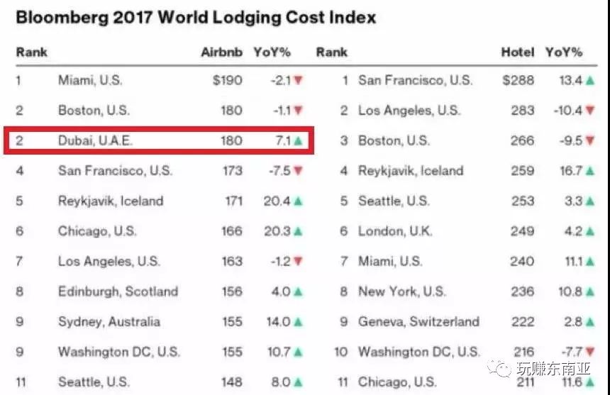 在Airbnb发布的2017年全球各大城市的租金数据中:迪拜世界排名第二,仅次于美国迈阿密,与酒店价格持平,未来还有上涨趋势。
