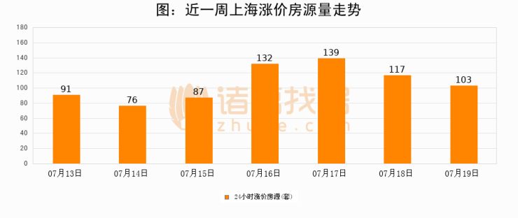 根据诸葛找房数据显示,上海24小时涨价房源量为103套,较07月18日减少14套,环比下降12%。与此同时,涨价房源占比小幅回落,对于购房者来说是一个入市窗口期,购房者可抓住时机入市。