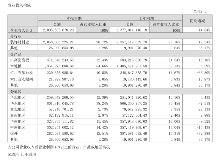 在营业收入构成方面,木地板作为主营业务,实现营收13.55亿元,占比59.13%,同比下滑3.59%,中高密度板实现营收4.71亿元,占比22.49%,同比下滑19.18%,竹、石塑地板实现营收2.20亿元,占比14.67%,同比下滑36.8%。