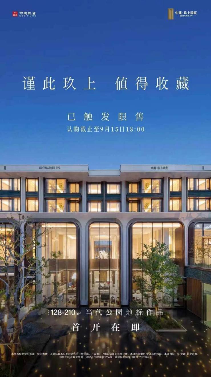 本资料仅为要约邀请,其中对项目周围环境、交通及其他公共设施的介绍仅供参考,不意味着本公司对此作出任何承诺。 本公司保留对本项目楼栋、景观等产品内容进一步优化的权利,所购房屋的交付标准应以双方签订的《上海市商品房预售合同》约定或政府部门最终批准之文件为准。本资料中提及的面积均为建筑面积。 本资料中所涉图文仅供参考,部分图片已经电脑画面处理以达最佳之视觉效果,如需了解项目实地情况及环境,请亲自视察为要﹔参与本资料制作之所有人等均已悉心维持所有资料在交付使用时之准确程度并尽力降低文误之可能,但仍不能完全避免,敬请谅解。本项目备案名﹕中建玖合园邸,本项目推广名为:中建玖上琅宸,开发商﹕上海玖知置业有限公司。预售许可证:静安房管(2025)预字0000266号],本资料的制作日期为﹕2025年9月