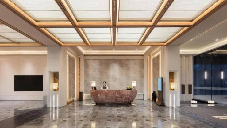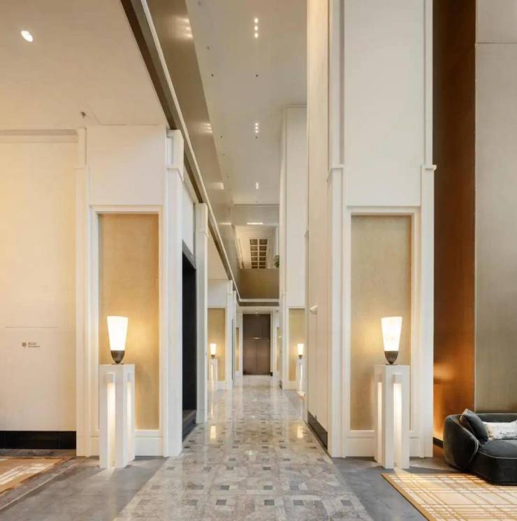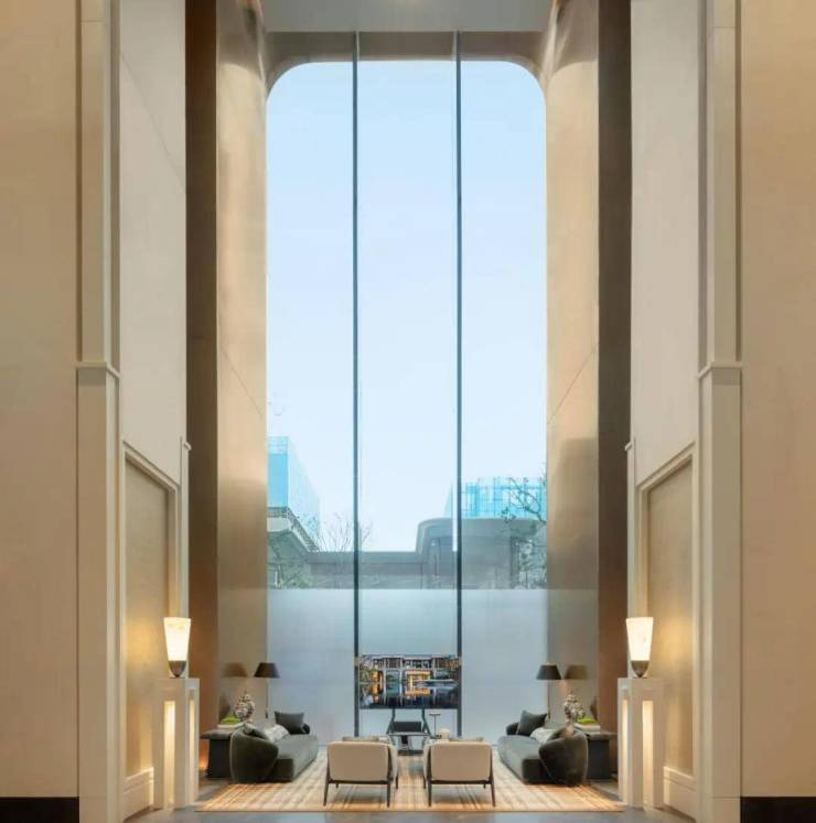 往里走就是迎宾区,整个公区部分由世界顶级的奢华酒店设计专家CCD负责设计,约4.5米的层高直接打造出了顶奢酒店的质感。