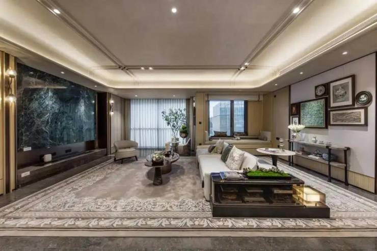 建面约210㎡四房:真正的终极置业之选,铸铝装甲入户门,门把手内嵌奢石;户内圆弧造型、海派经典元素,基于人性化洞察的细节随处可见。采用整块星空猫眼大理石打造的奢石背景墙,致敬荣宅的门头造型;并简化繁复的线条,勾勒出客厅纵横交错的浮雕勾线。