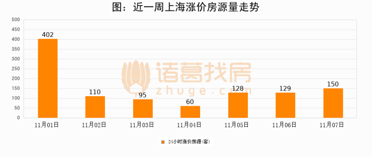 根据诸葛找房数据显示,上海24小时涨价房源量为150套,较11月06日增加21套,环比上涨16.3%。与此同时,涨价房源占比小幅扩大,业主信心有所提升。