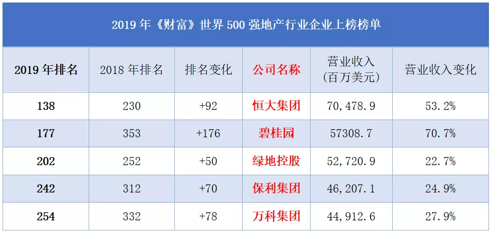 2019年,《财富》500强榜单有5家房地产企业,且均来自于中国。