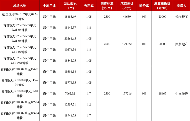 青浦老城QPC10007单元D4-01、D5a-01、J5-01、K2-04、K3-04地块由中交城投竞得,成交总价约18亿元,成交楼板价18467元/㎡。
