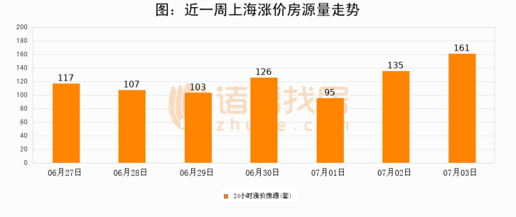 根据诸葛找房数据显示,上海24小时涨价房源量为161套,较07月02日增加26套,环比上涨19.3%。与此同时,涨价房源占比小幅扩大,业主信心有所提升。