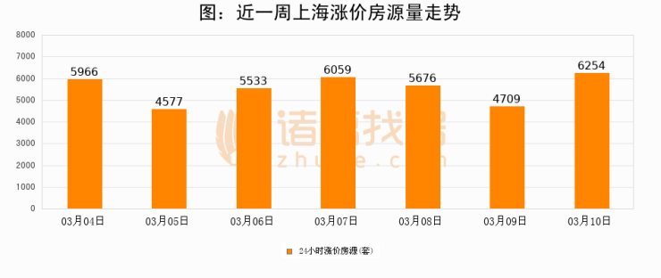 根据诸葛找房数据显示,上海24小时涨价房源量为6254套,较03月09日增加1545套,环比上涨32.8%。与此同时,涨价房源占比小幅扩大,业主信心有所提升。