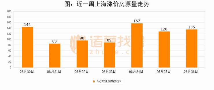 根据诸葛找房数据显示,上海24小时涨价房源量为135套,较06月25日增加7套,环比上涨5.5%。与此同时,涨价房源占比小幅扩大,业主信心有所提升。