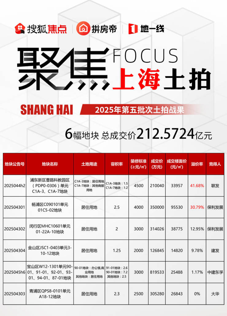 上海五批次土拍揽金超212亿,浦东曹路地块溢价率高达41.68%