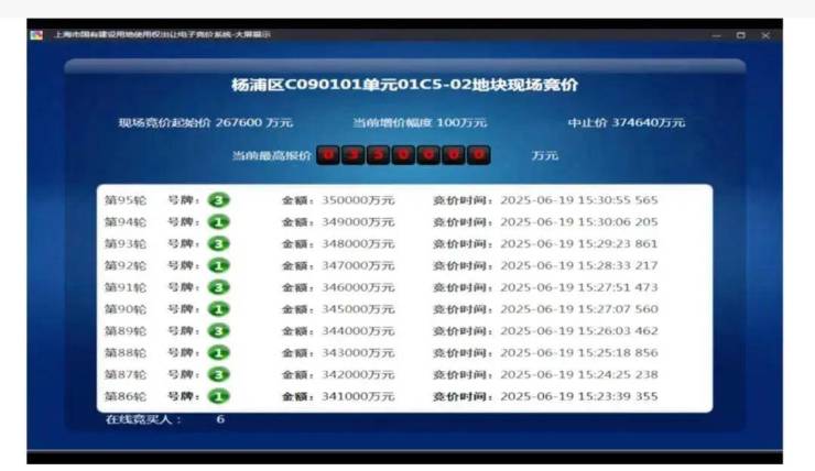 杨浦区C090101单元01C5-02地块共吸引6组竞买人参与现场竞价,分别为:1上海城建、2中海、3保利发展、4越秀、5招商&南通瑞城、6华润&中能建。