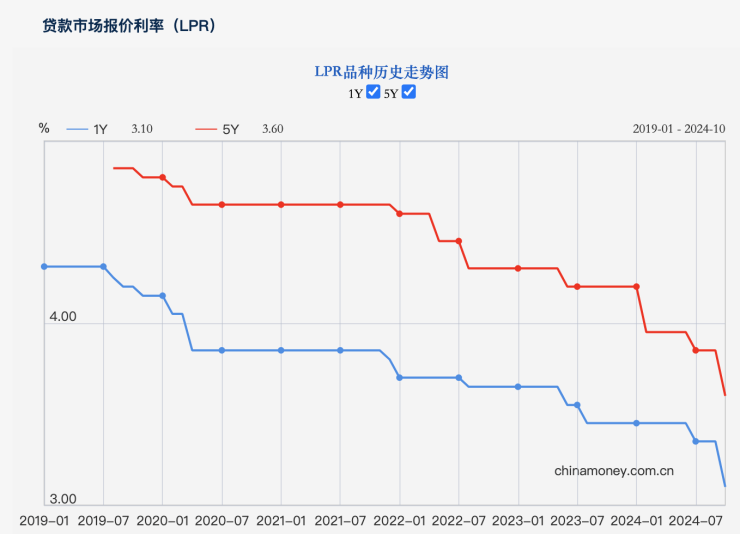 中国人民银行授权全国银行间同业拆借中心公布,2024年10月21日贷款市场报价利率(LPR)为:1年期LPR为3.10%,5年期以上LPR为3.60%。均下降了25个基点。