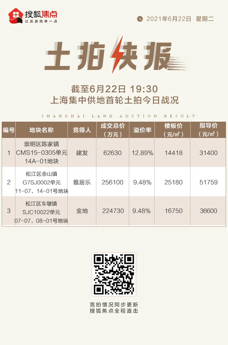 今日3幅地块分别位于松江佘山、松江车墩以及崇明陈家镇,都为纯宅地。因有效竞买人都在7人及以上,故均以竞价招标方式出让。