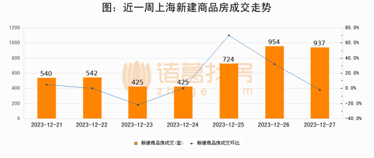 根据上海市房地产交易中心数据显示,2023年12月27日上海新建商品房成交937套,较昨日减少17套,环比下降1.8%