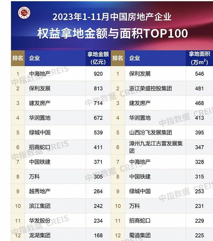 2023前11月保利登顶“宇宙房企”,万科拿地金额仅居第八