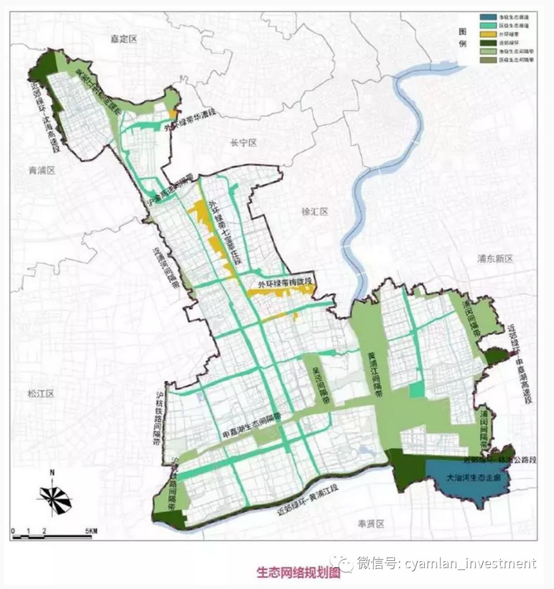 落实上海市基本生态网络,形成“一廊两环五带”的总体生态结构,其中“一廊”指大治河生态走廊,“两环”指近郊绿环及外环绿带,“五带”指黄浦江间隔带、浦闵间隔带、吴泾间隔带、申嘉湖间隔带、吴淞江间隔带等生态间隔带。