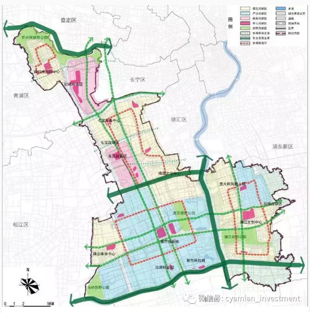 依托七莘路、外环-S4抬升、嘉闵线南延伸等纵向干线和嘉闵线、5号线等纵向轨道交通网络,串联城市公共中心和重要就业核心,形成南北向的城市综合服务轴,促进板块整合与就业服务的均衡布局。