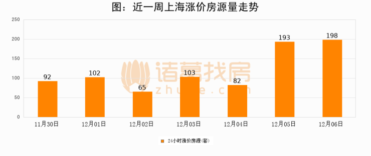 根据诸葛找房数据显示,上海24小时涨价房源量为198套,较12月05日增加5套,环比上涨2.6%。与此同时,涨价房源占比小幅扩大,业主信心有所提升。