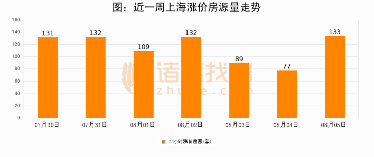 根据诸葛找房数据显示,上海24小时涨价房源量为133套,较08月04日增加56套,环比上涨72.7%。与此同时,涨价房源占比小幅扩大,业主信心有所提升。