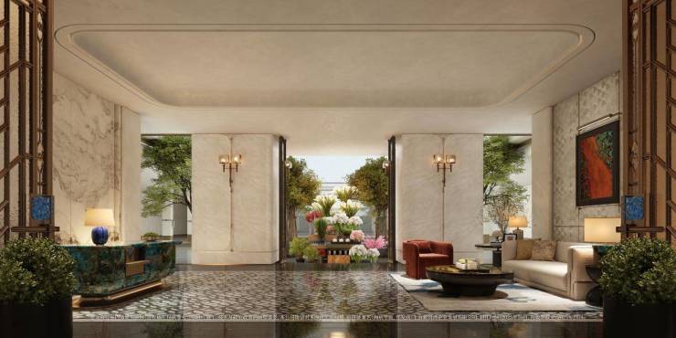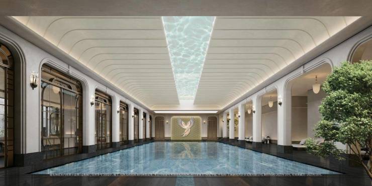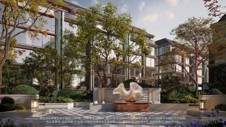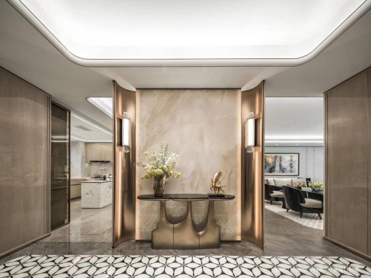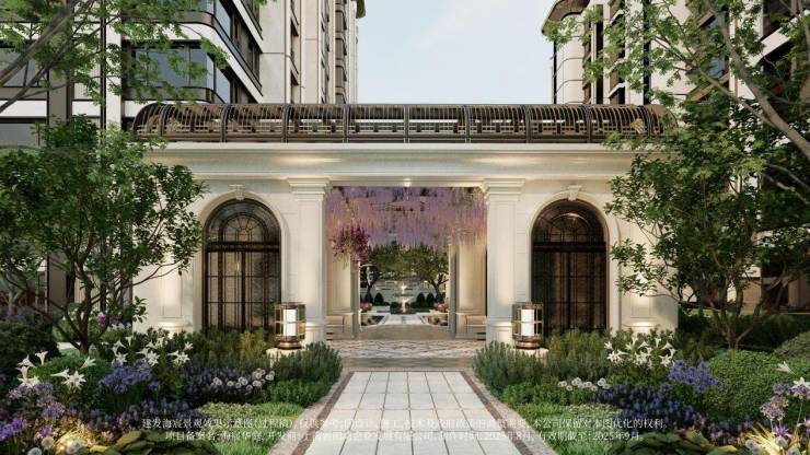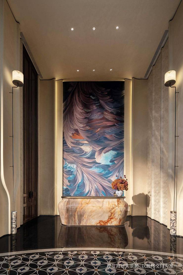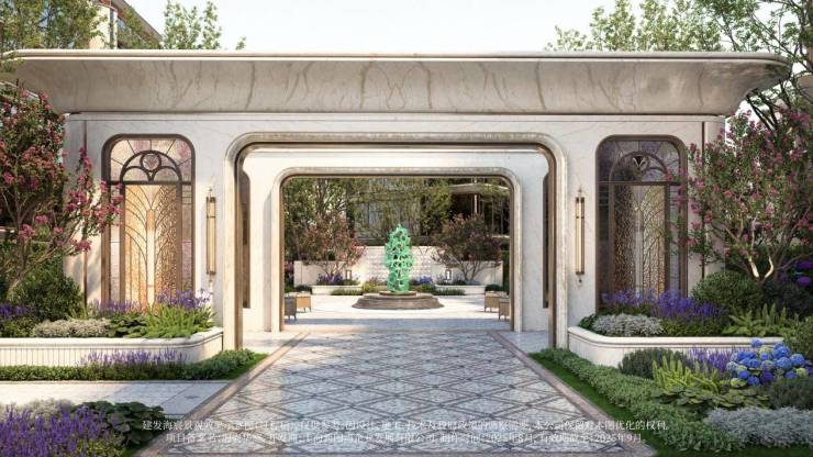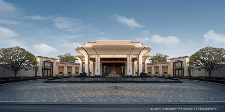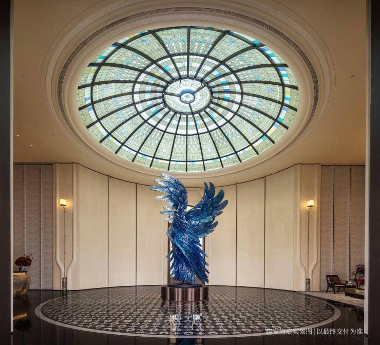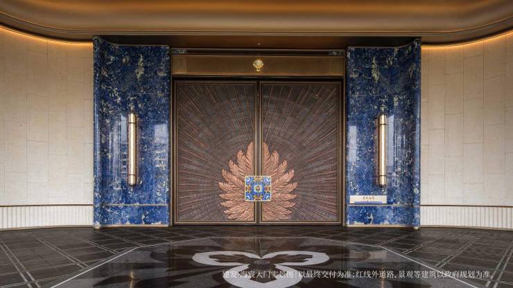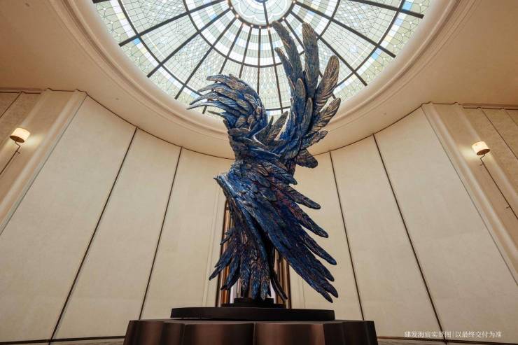 以玉兰门庭—迎归大堂—莳花荟为主轴,敬献步履生辉的归家艺旅:玉兰门庭如繁花盛绽,尊华瑞鳞水景聚运生财,双尊铜狮镇守家宅;迎归大堂流转光影艺韵,百羽栖澜艺术雕塑、芦海宸韵非遗绣作流淌摩登气韵;莳花荟中央会客厅移步异景,献映会客、休闲等雅会。