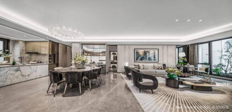 建面约100㎡社交巨厅,涵盖玄关、餐厅、客厅、厨房与阳台五大场域,可容纳10人大圆桌,聚合社交、宴会等功能。