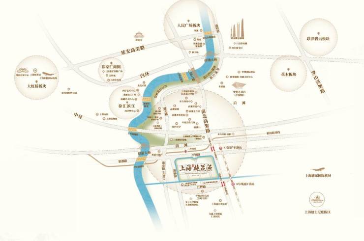 上海桃花源坐落于世博前滩南黄浦江畔,占据城市交通枢纽与生态绿肺的双重核心。项目北邻芦恒路隧道,出门即达南北高架上下匝道口,加之机场联络线三林南站的交通优势,前往虹桥、浦东两大国际机场,都仅需20分钟左右,尽享“一线二环三桥四隧”的立体交通网络。