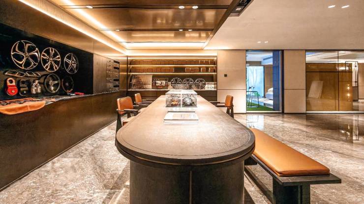 HBA吕锦明团队则以“复古与时尚的共舞”为核心,重塑海派风情的独特韵味。客餐厅内,深色进口大理石拼花与金属屏风相映成趣,老上海风情照片与拱形金属吊顶交织在一起,完美复刻了摩登年代的精致与格调。地下会客厅挑空设计巧妙还原了老上海弄堂天井的社交场景,红酒雪茄吧与车库之间以艺术玻璃相连,爱车如同艺术品般静默陈列,为空间注入灵动美感。更值得一提的是“秘境书房”的设计,双弧形天花犹如机翼悬空,螺旋桨装置与旅行箱书桌巧妙融合,暗含主人游历世界的丰富阅历,使整个空间成为故事与品味的完美载体。