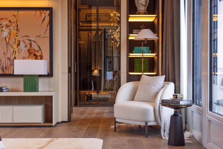 CCD创始人郑忠以“隐逸山水”为核,重构东方美学的当代表达。主卧落地窗借鉴园林“框景”手法,将四季变换的自然景观引入室内,与天然大理石背景墙相映成趣,营造出室内外交融的诗意氛围。书房内,手工刺绣墙面与古朴书架相搭配,古籍陈列有序,落地窗引入充足自然光,使整个空间充满静谧与雅致,成为一处可阅读的文化天地。地下一层采用双庭院设计,以通透的玻璃幕墙打破传统地下室的压抑感,让光线与空气自由流通。浅灰基调中点缀蓝绿玉石与金属板,不仅提升了空间的现代感,更深刻诠释了物质与精神之间的微妙平衡。