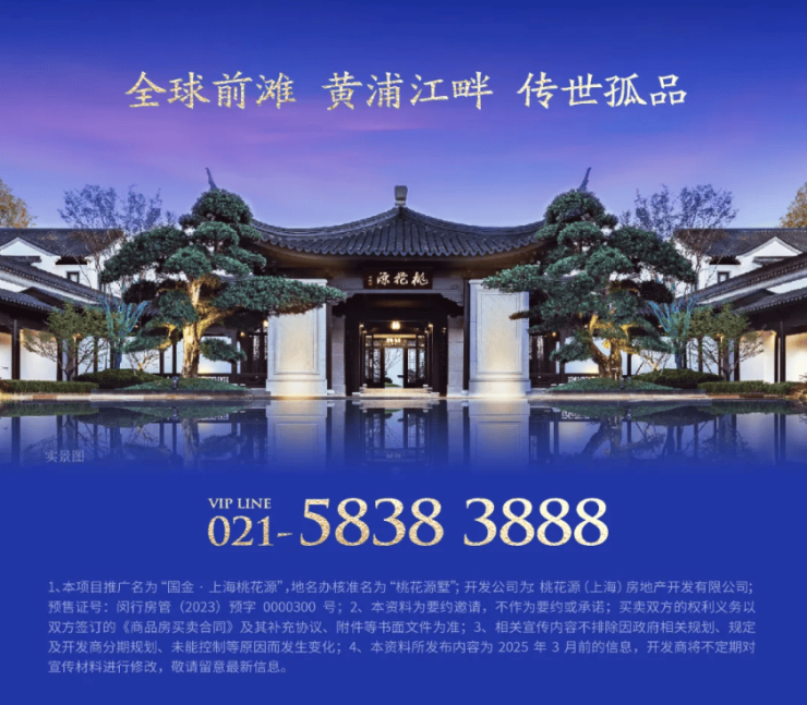 八载沉淀,终成传世孤品。目前在售主力产品实得面积约600-1500平方米,总价范围约4000万元至1亿元及以上。上海桃花源以一座宅院,收藏东方文脉与当代奢雅,在浦江畔的流光中,为时代人物缔造“出则繁华,入则桃源”的理想之境。