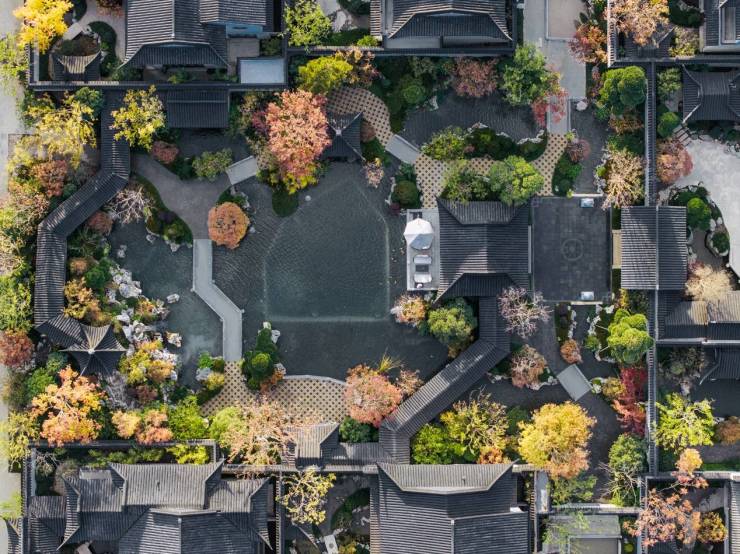 上海桃花源由非遗“香山帮”匠人历时多年匠心营造。项目以江南园林为蓝本,从飞檐戗角的形制到花街铺地的传统工艺,每一细节皆彰显对东方文化的敬畏与创新。金瑞园以江南园林为范,遵循九经九纬规制,呈“围龙宝地”之势。