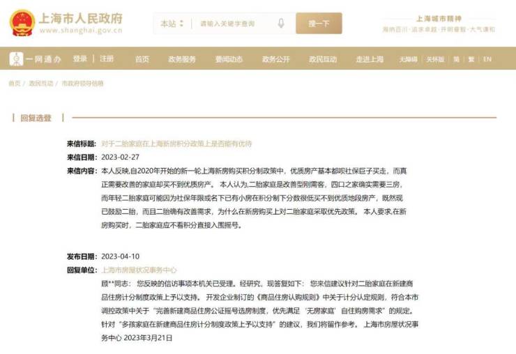 近日,有上海市民通过市政府领导信箱留言,建议二胎家庭在上海新房购买积分政策上享受一定优待。4月10日,上海市政府官网发布了市房屋状况事务中心对此作出的回复。