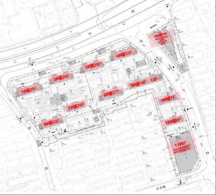根据方案,两幅地块规划总用地面积39686㎡,总建筑面积172234㎡,地上计容面积114461.32平方米,其中可供出售的商品房为835套、总面积为101062㎡,拟建7栋25-33F高层、4栋6-10F洋房、1栋19F保障房。