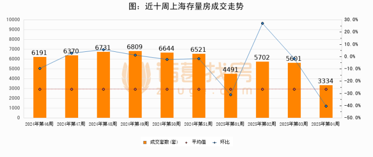 存量房方面,第04周上海存量房成交3334套,较上周减少2267套,环比下降40.5%。从近十周成交走势来看,周均成交套数为5839套,本周低于平均水平42.9%。