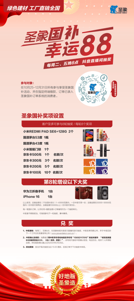 记者从圣象集团市场部门获悉,此阶段的圣象国补政策以“高”、“大”、“快”、“广”、“全”五大显著优势区别于其他品牌。其中“高”,指的是享受补贴额度之高,这意味着圣象在企业补贴5%的基础之上叠加国家补贴15%,结合各门店、各商场即将到来的跨年活动,再送一份跨年礼;同时推出圣象国补幸运88的抽奖活动。凡是在10月25日-12月31日参与享受圣象国补活动的消费者均可参与到8轮抽奖,每轮8个奖项的抽取当中。礼品涵盖国酒茅台、小米pad、小米智能门锁、京东卡等硬货,终极抽奖将增加华为三折叠手机1台、iphone16一台,如此大的抽奖力度形成国补+国礼,优惠+钜惠的强大支撑,一心一意将圣象全品类的好品质、好服务、好科技、好产品、好福利送进更多家庭。