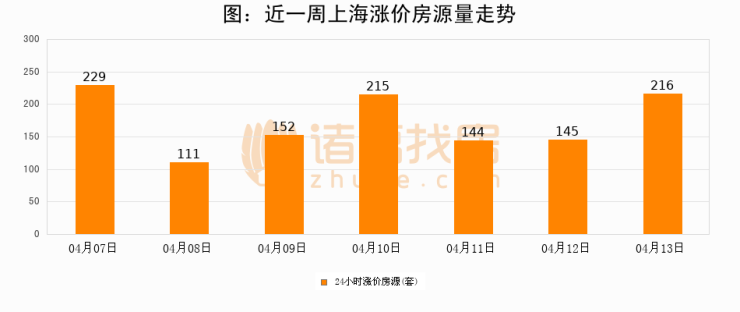 根据诸葛找房数据显示,上海24小时涨价房源量为216套,较04月12日增加71套,环比上涨49%。与此同时,涨价房源占比小幅扩大,业主信心有所提升。