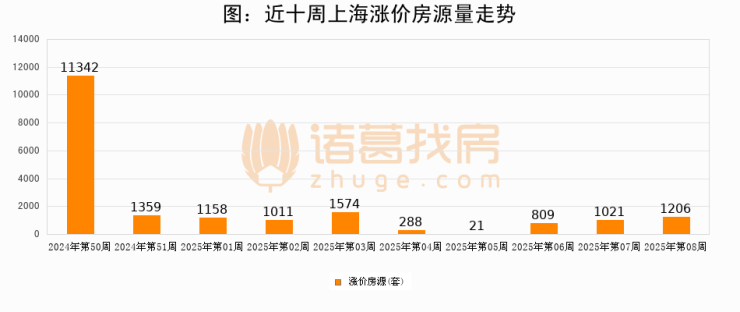从调价房源来看,第8周上海涨价房源1206套,较上周上涨18.1%。与此同时,8周涨价房源占比提升0.05个百分点,业主信心持续恢复。