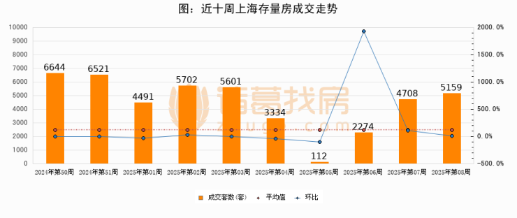 存量房方面,第08周上海存量房成交5159套,较上周增加451套,环比上涨9.6%。从近十周成交走势来看,周均成交套数为4454套,本周高于平均水平15.8%。