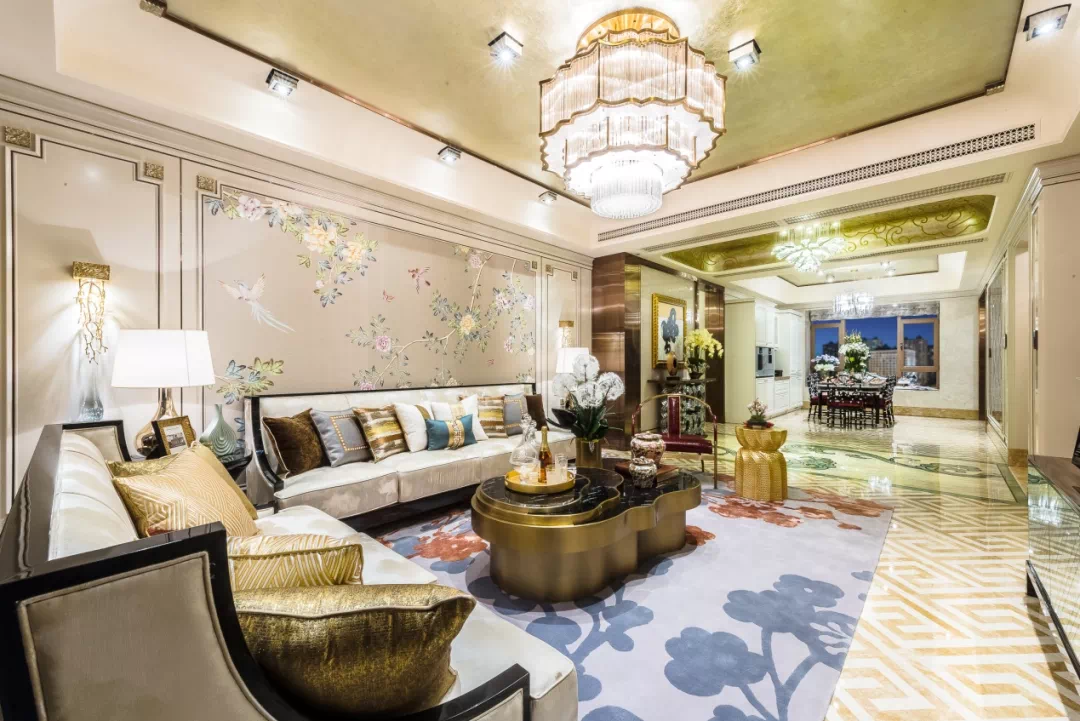 无论是玄关地板上孔雀玉&皇家翡翠的高难度无缝拼花工艺、屋顶上祥云样式的金箔饰面还是客厅墙面上工艺复杂的刺绣,乃至细节严苛到每一扇隐形门的皮雕、金属饰条,均品质少有。