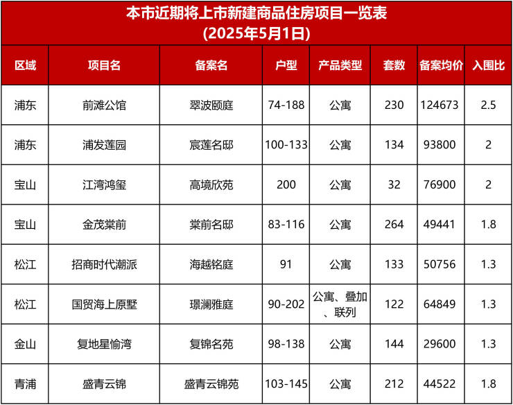 五一小长假第一天,上海网上房地产公示,近期将上市新建商品住房新增8个,共约14.6万方,合计1271套房源,分布在浦东、宝山、松江、金山和青浦5区。