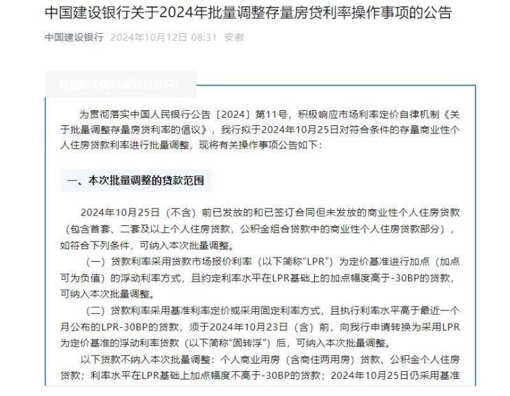 中国建设银行发布《关于2024年批量调整存量房贷利率操作事项的公告》。公告称,可纳入本次批量调整的浮动利率贷款,无需借款人申请,我行将于2024年10月25日统一进行批量调整,充分满足客户利率调整的便捷性需求。