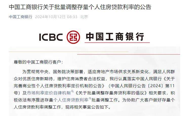 10月12日上午,中国银行、中国工商银行、中国农业银行和中国建设银行均发布了关于存量个人住房贷款利率批量调整的公告。