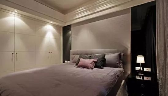 床头两侧使用墨镜制造视觉延伸效果,细节如金属框边和黑水晶把手,传达居住者的时尚品味。素雅的进口壁纸四周斜贴茶镜,注入低调华丽氛围。