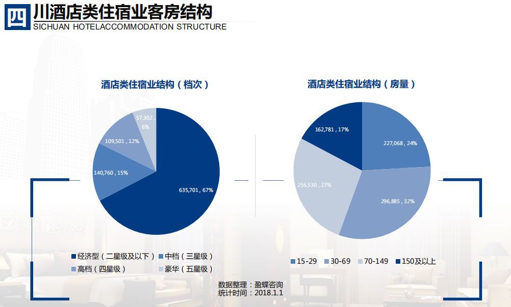 全国酒店类住宿业客房规模在29间及以下的设施数为154,191家,客房规模在30-69间的设施数为100,512家,客房规模在70-149间的设施数为49,048,客房规模在150及以上的设施数为13,725家,上述四类规模的设施在总量中所占比重分别为49%、32%、15%和4%。