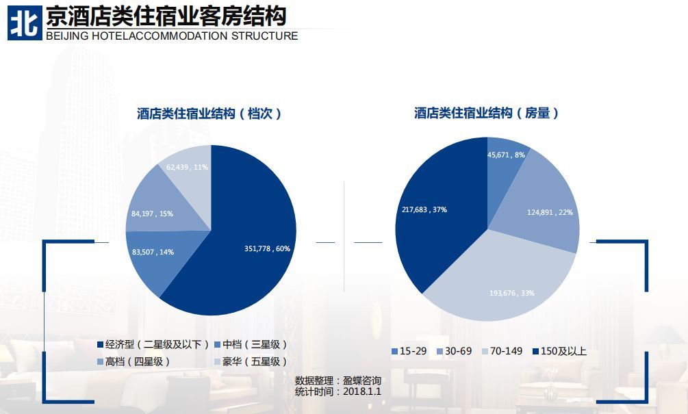 从客房数来看,经济型(二星级及以下)的客房数约为1039万间、占67%, 中档(三星级)的客房数约为214万间、占14%,高档(四星级)的客房规模约为181万间、占12%,豪华(五星级)的客房数为114万间,占7%。由此可见,绝大部分的酒店类住宿设施都是低端设施。
