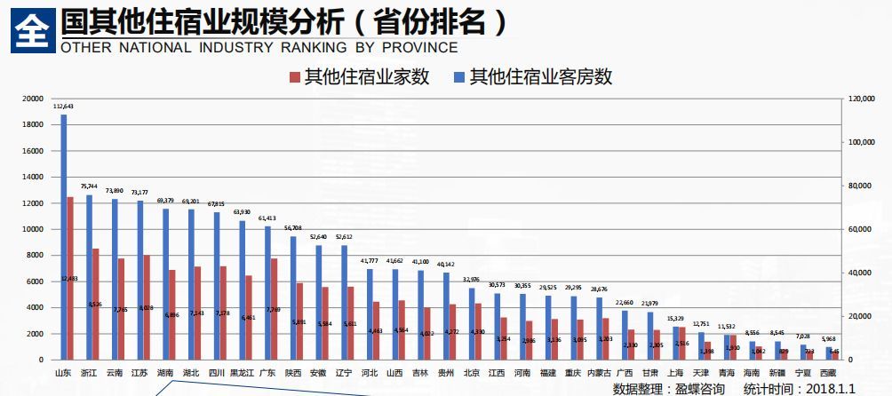 ·客房数最多的十个区域分别是山东、浙江、云南、江苏、湖南、湖北、四川、黑龙江、广东和陕西。其中,山东省的客房数最多,超过了11万间,浙江、云南和江苏的规模在7-8万间左右,其余几个区域的客房数也都在5.6万间以上。