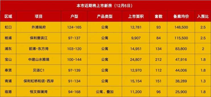 12月6日,网上房地产公示本周的新盘过会名单,共涉及7个项目,总计将为市场新增882套新房供应,覆盖浦东、虹口、杨浦、宝山、奉贤、青浦、临港等多个区域。