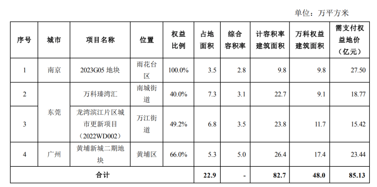 3月份,万科新增开发项目4个,分别位于南京、东莞及广州,万科权益建筑面积约48万平方米,需支付权益地价85.13亿元。综合来看,今年一季度,万科共新增开发项目5个,合计权益地价94.93亿元。