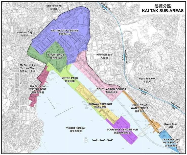 启德新区整体规划面积范围达320公顷,被划分为启德城中心、体育场馆区、都会公园、跑道休闲区、旅游及休闲中心、南停机坪角六大区域,连同观塘及九龙湾商贸区,已被政府定位为香港第二大核心商业区,号称“香港第二中环”。(来源:启德分区计划大纲草图编号S/K22/5)